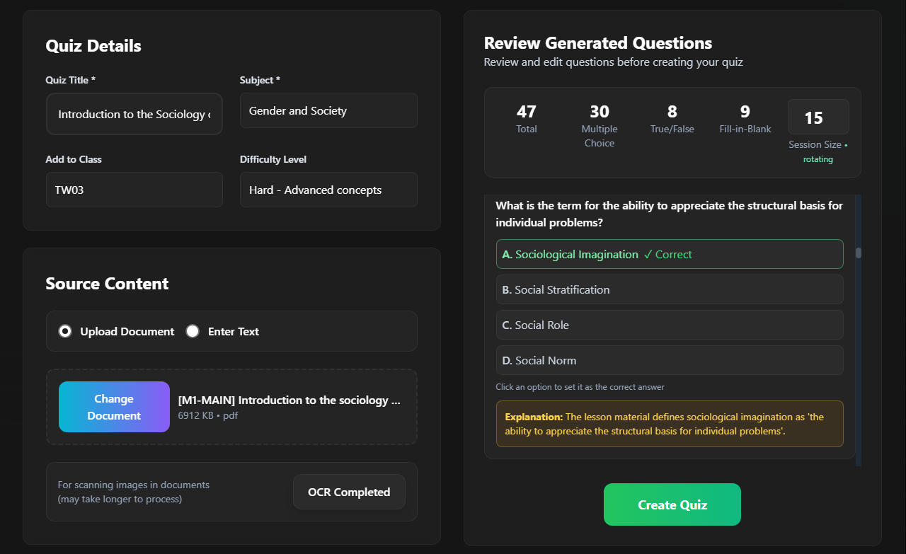Upload PDFs or PowerPoints. Our AI analyzes content and creates perfectly tailored questions instantly.