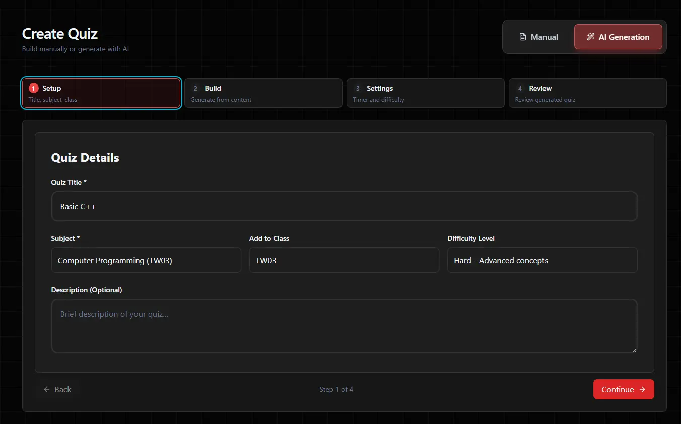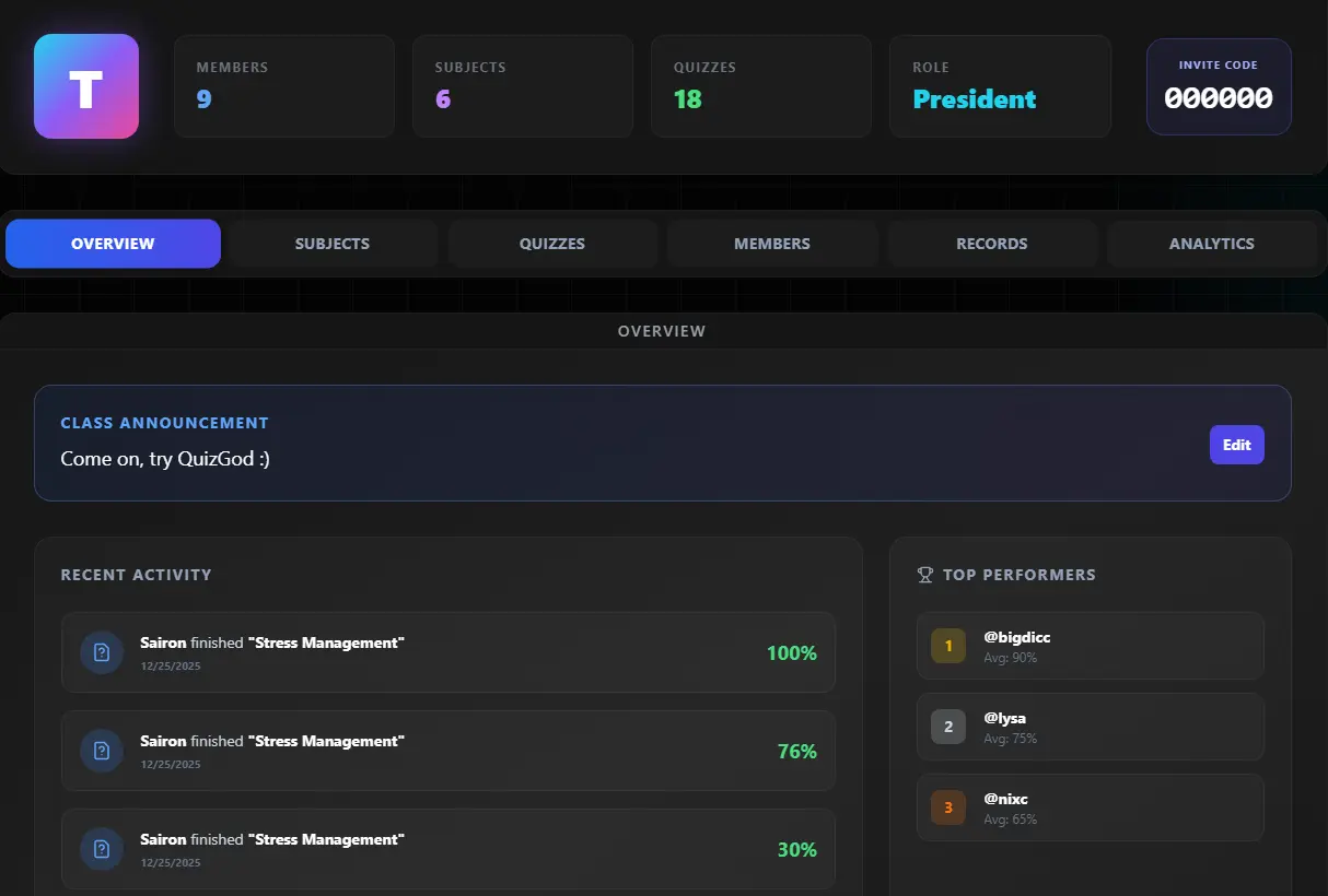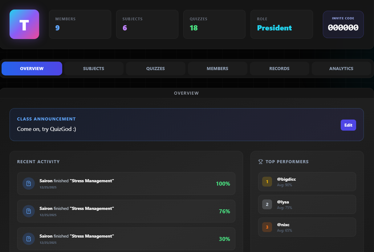 Create and manage multiple classes with ease. Create class quizzes, track student progress, and view detailed analytics for each class and student.